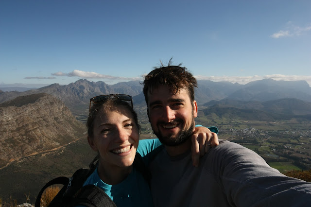 We started out at Dieux Donne, a winery up on a hill overlooking the valley, and continued up the road to Franschoek Pass. We didn't have a map of hikes, so we were sort of flying by the seat of our pants. After checking out a trail off the side of the road, we spotted a more "official" spot to start a hike - complete with a parking lot - and set off on a beautiful hike up the back side of one of the mountains framing the valley.